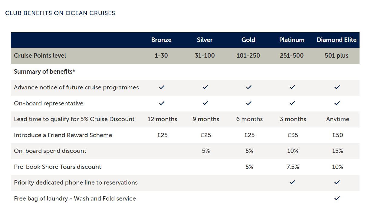 Welcome to the Oceans Club Every guest becomes a member automatically after their first cruise with us. It’s our way of saying thank you for sailing with us! How it works You’ll earn 1 cruise point for every night spent on board (from 1st January ...
